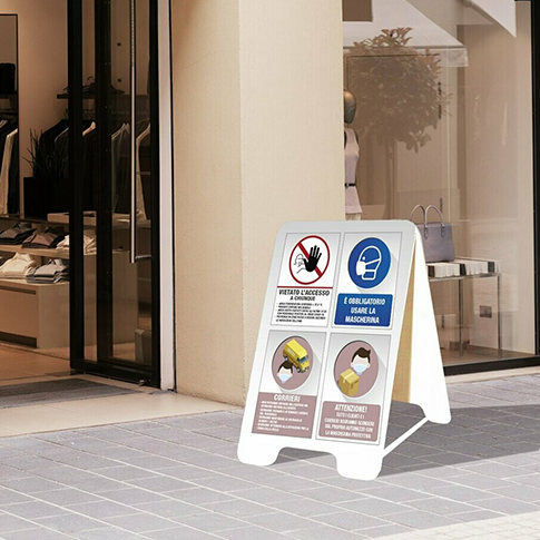 Pratico cavalletto informativo bifacciale di sicurezza, realizzato in polipropilene alveolare dello spessore di 10 mm. Stampato in quadricromia digitale diretta, fornito completo di aste per il montaggio. Dimensioni L 75 x H 100 cm (per lato).